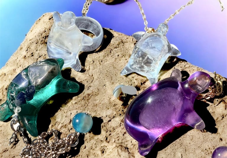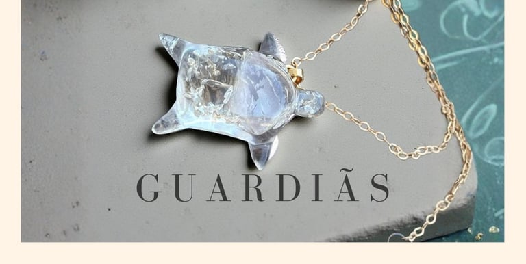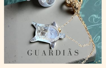 Pequenas tartarugas em resina, polidas à mão e moldadas uma a uma. Cada uma carrega em seu interior uma pedra natural: símbolo de força, tempo e emoção. São joias em forma de pingente ou anel, criadas para proteger e inspirar.
